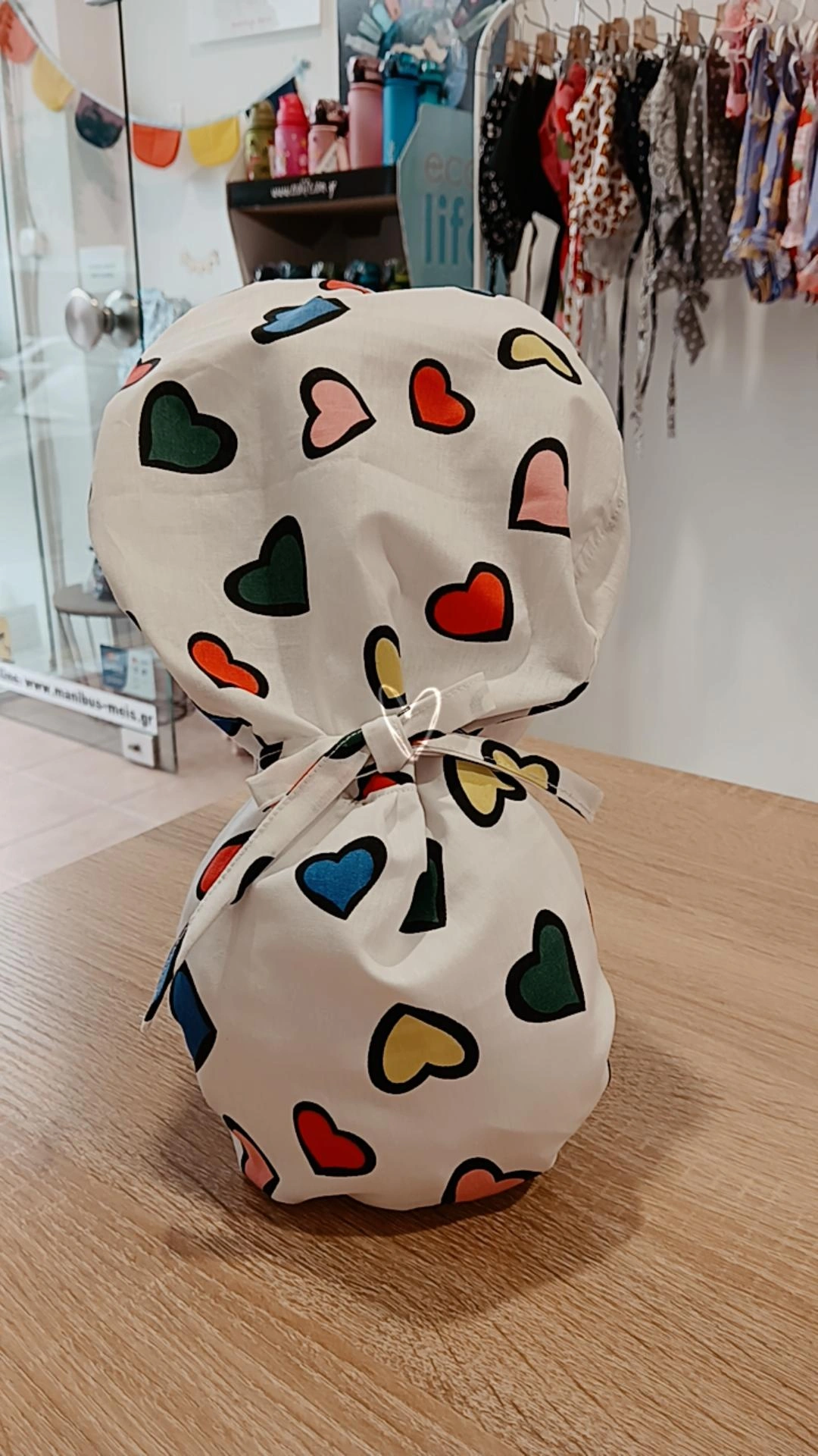 4. Χειροποίητο σκουφάκι Premium Ponytail Satin Lining “Πολύχρωμες Καρδιές”
